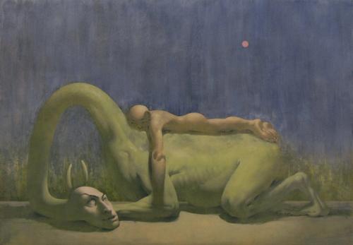 Así, en esta exposición nos volvemos a acercar a la pintura desde una figuración extraña. Álvaro nos propone un universo que parece del futuro, en escenarios estáticos y casi inverosímiles; en sus personajes entendemos la humanidad vista a través de las posibilidades que el destino nos tiene preparadas como especie. Hay una ternura en el desasosiego de los frisos que con meticulosa técnica el artista nos presenta como ofrendas traídas desde un lugar que aún no conocemos, pero que con el tiempo es probable que lleguemos a alcanzar. Lo onírico es patente, pero no nos atrevemos a decir que los momentos retratados sean producto de un sueño: a pesar de lo híbrido de sus personajes, su humanidad nos hace cuestionarnos sobre lo que somos en este momento, donde el hombre como hegemonía ha perdido su valor. Además del cosmos tan atractivo –por extraño, quizá– que Álvaro lleva desarrollando en su corta carrera, estamos profundamente interesados en su capacidad técnica, en la valentía de adentrarse en un lenguaje que pendula hacia lo ilustrativo; la contradicción del sujeto con la joven maestría de su técnica pictórica es lo que nos engancha y convence para preguntarnos sobre otras capacidades expresivas de la pintura.